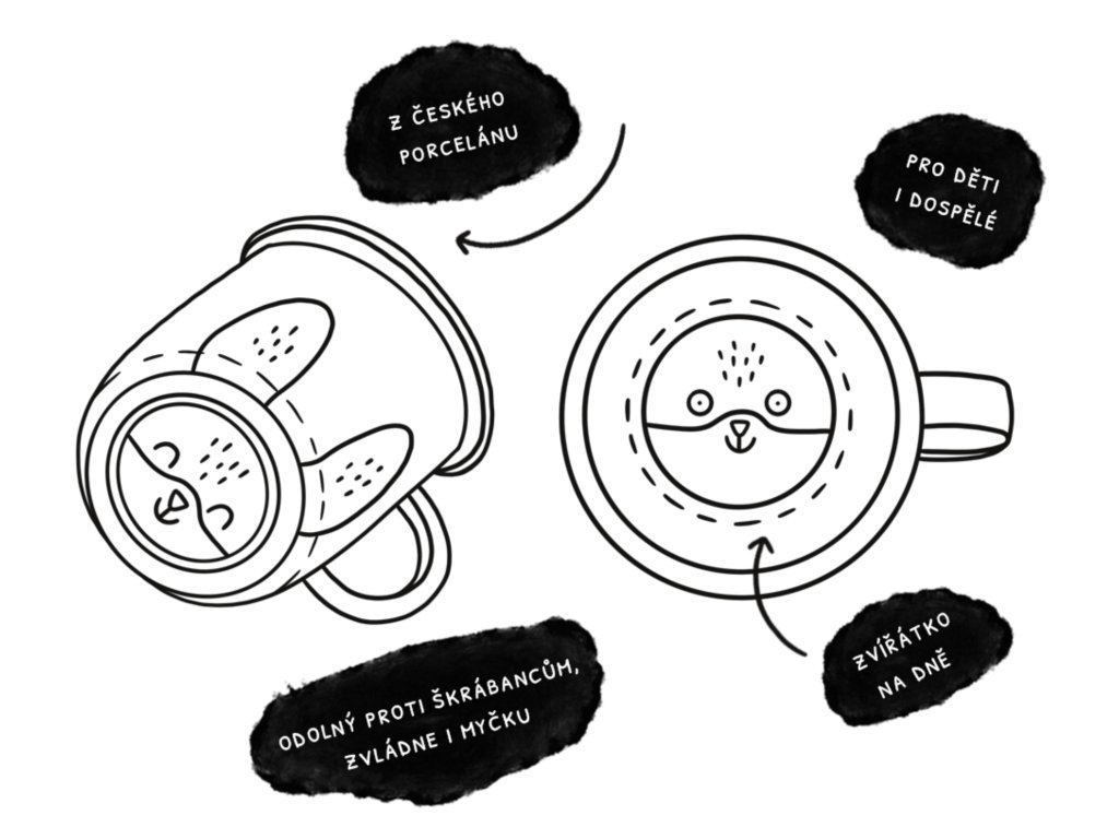 Po dopití nápoje se vám za odměnu ukáže na dně zvířátko s otevřenýma očima. Po natočení hrnku v ruce se odhalí potisk na spodní části hrnečku. Nechybí ani ABABU logo na vnitřní straně hrnku. Potisky jsou záměrně otočené všechny na uživatele hrnečku.
