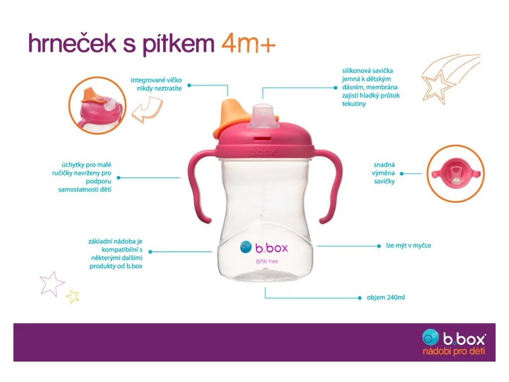 Je vaše dítě připravené odložit kojeneckou lahev? Konec ztracených víček v supermarketu a hledání pasujících víček na hrneček v kuchyňské skříni! Hrneček od oblíbené australské značky b.box má ergonomicky tvarovanou savičku vyrobenou ze silikonu, která je jemná k dětským dásním.