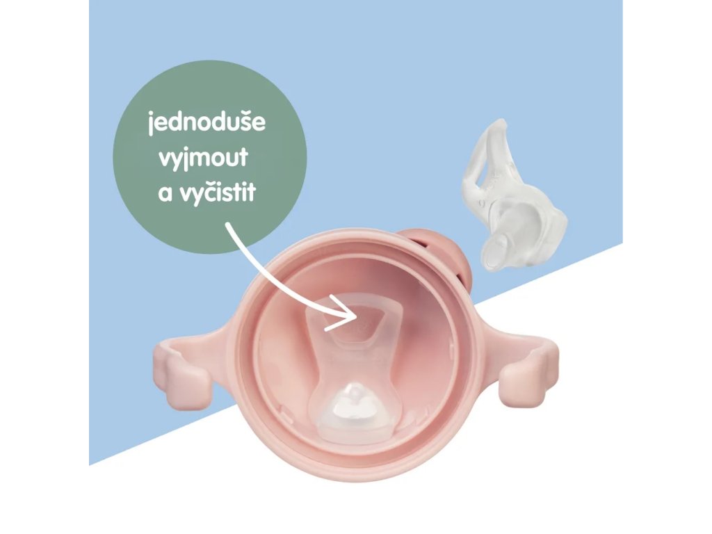 Na víčku hrnečku je připevněný kryt na savičku, takže jej nikdy neztratíte a ochrání savičku před nečistotami. Jednoduché ergonomické úchyty na hrnečku a snadné odklopení víčka podporují samostatnost vašeho dítěte.