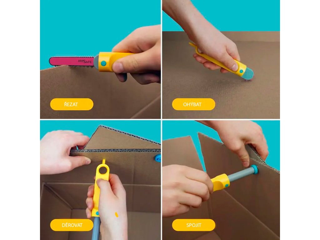 - Bezpečné tvoření: Speciálně navržené nástroje umožňují dětem bezpečně řezat, ohýbat a spojovat recyklovaný karton bez rizika, které hrozí u běžných řezáků.