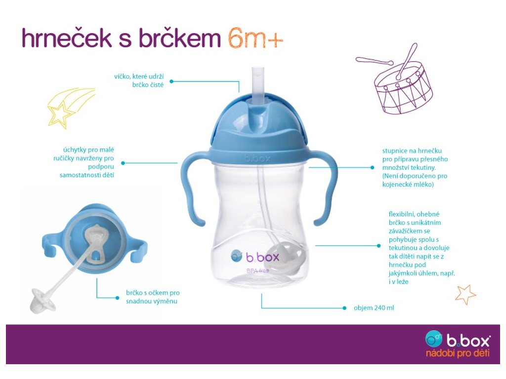 Oblíbený netekoucí hrneček se silikonovým brčkem pro děti od 6 měsíců Hrneček s brčkem australské značky b.box je oceňovaný dětmi, rodiči i odbornou veřejností!
