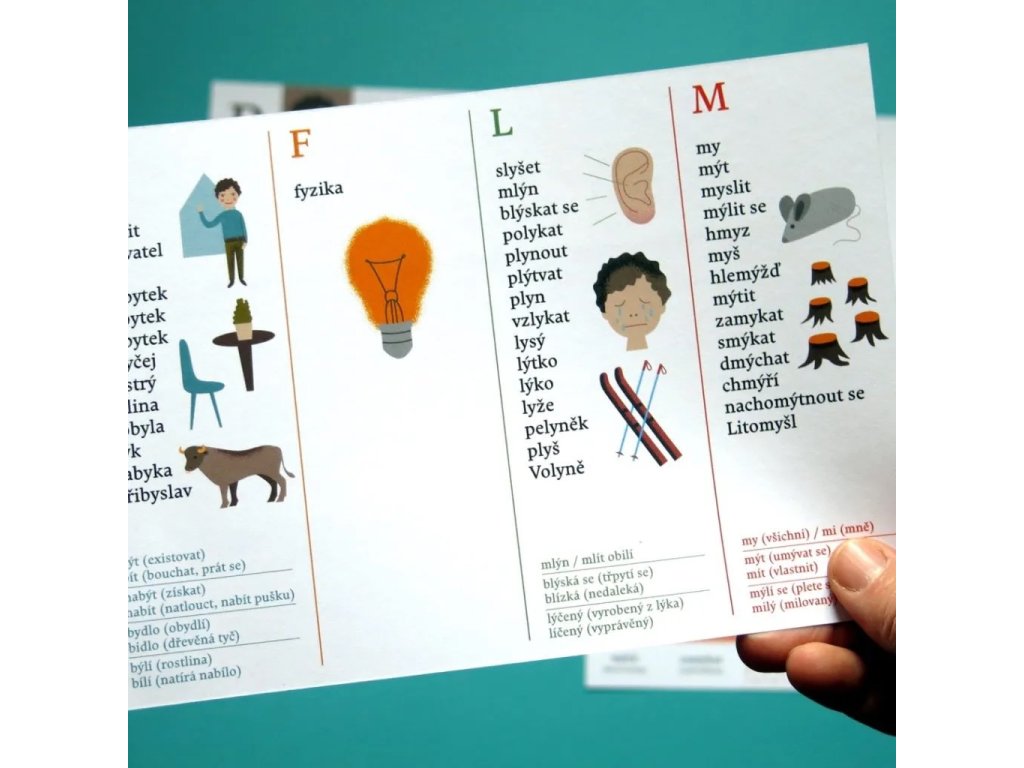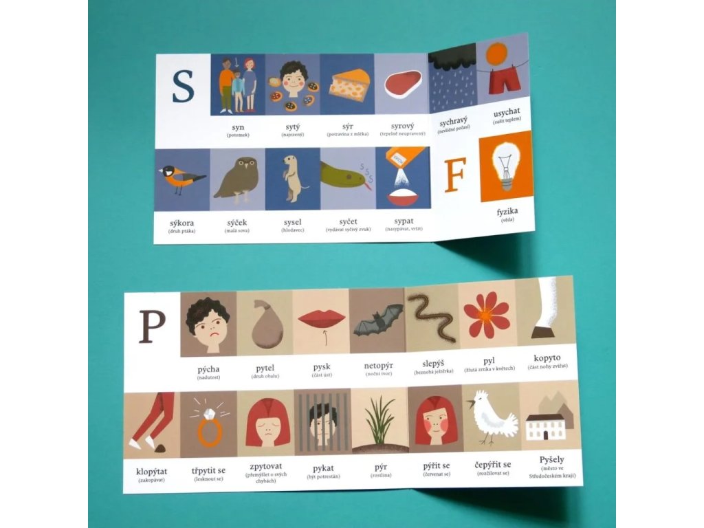 Syn, sytý, syrový… kdo z nás si nepamatuje martyrium biflování vyjmenovaných slov? Usnadněte dětem učení pomocí těchto ilustrovaných karet. Sada obsahuje šest karet s nejpoužívanějšími vyjmenovanými slovy po B, F, L, M, P, S, V, Z a jednu přehledovou. Jednotlivá slova jsou znázorněna obrázkem a doplněna stručným vysvětlujícím textem. Tento přístup umožňuje dítěti jednak pochopit význam (což je důležité zejména u málo používaných slov), ale usnadňuje mu i zapamatování díky vizualizaci. Nezbytná výbava pro každého třeťáka.