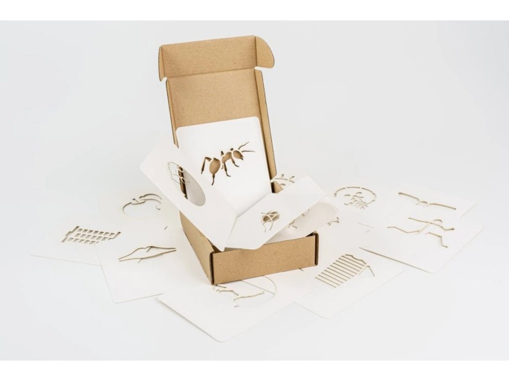 - 20 karet z tvrdého papíru s prořezanými obrázky zvířat, předmětů, dopravních prostředků, emocí atd.