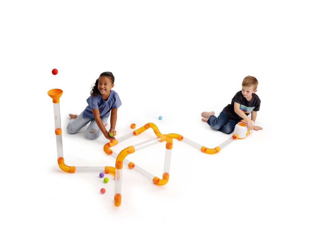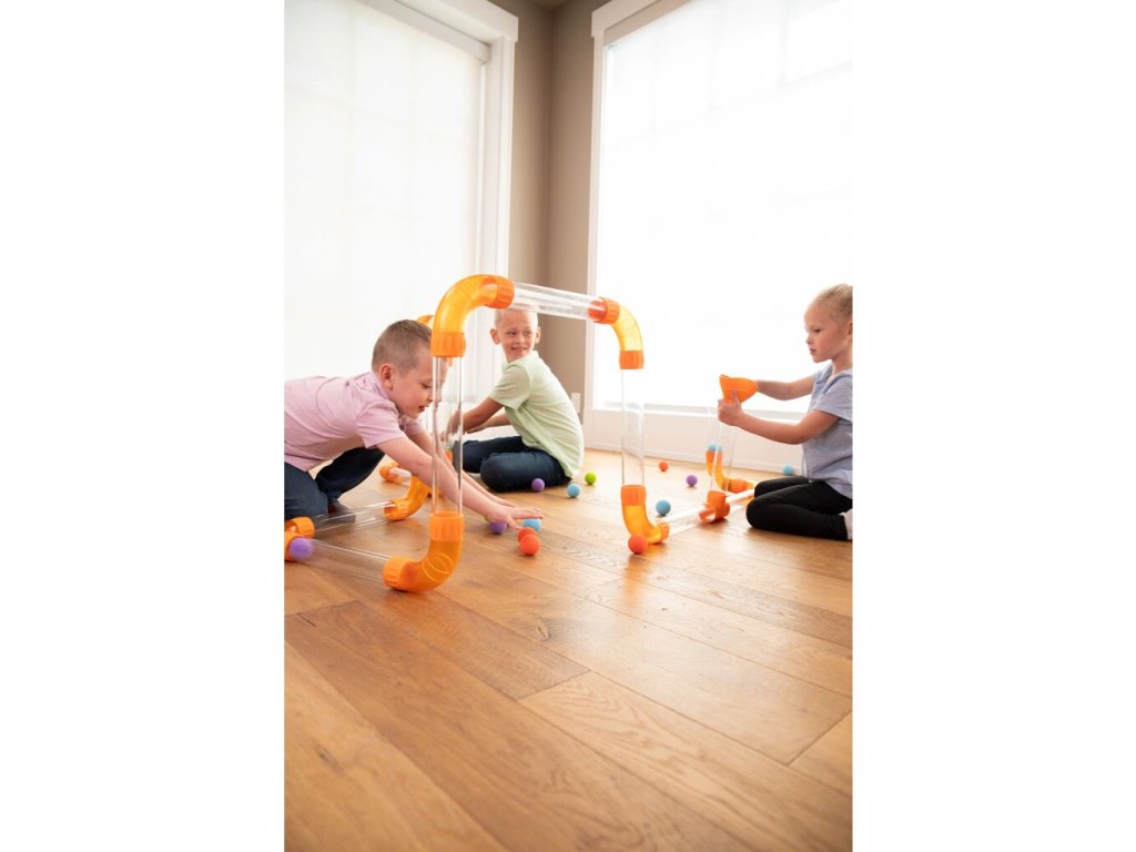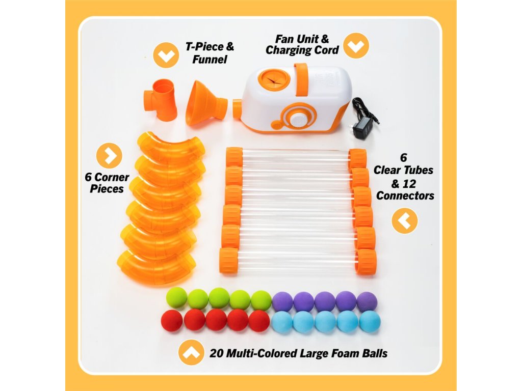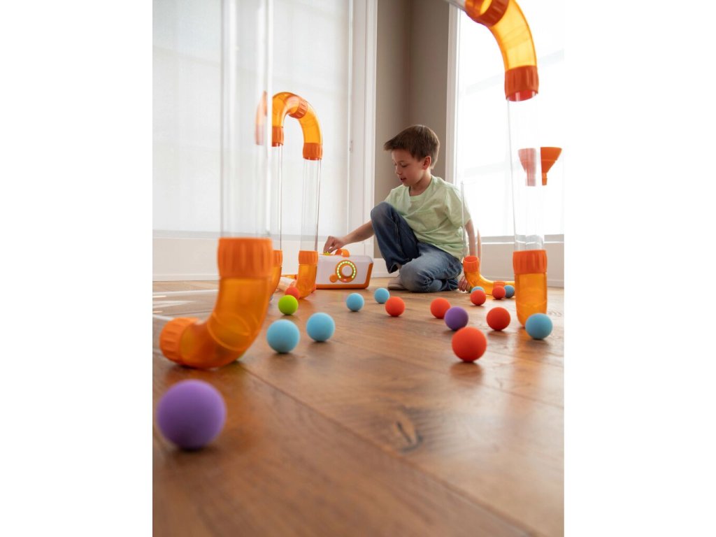 Sestavte trubky a spojky libovolným způsobem. Experimentujte, vytvářejte smyčky a záhyby, proplétejte trubky pod stolem a nad židlí. Poté zapněte foukací přístroj a sledujte, jak míčky sviští bludištěm poháněné vzduchem. Zjistěte, co se stane, když nastavíte nízkou nebo vysokou sílu foukání, když vložíte všechny míčky najednou do bludiště, nebo jestli se vám podaří sestavit trubky tak, aby míčky přeskakovaly z jednoho otvoru do druhého, nebo se vznášely ve vzduchu.