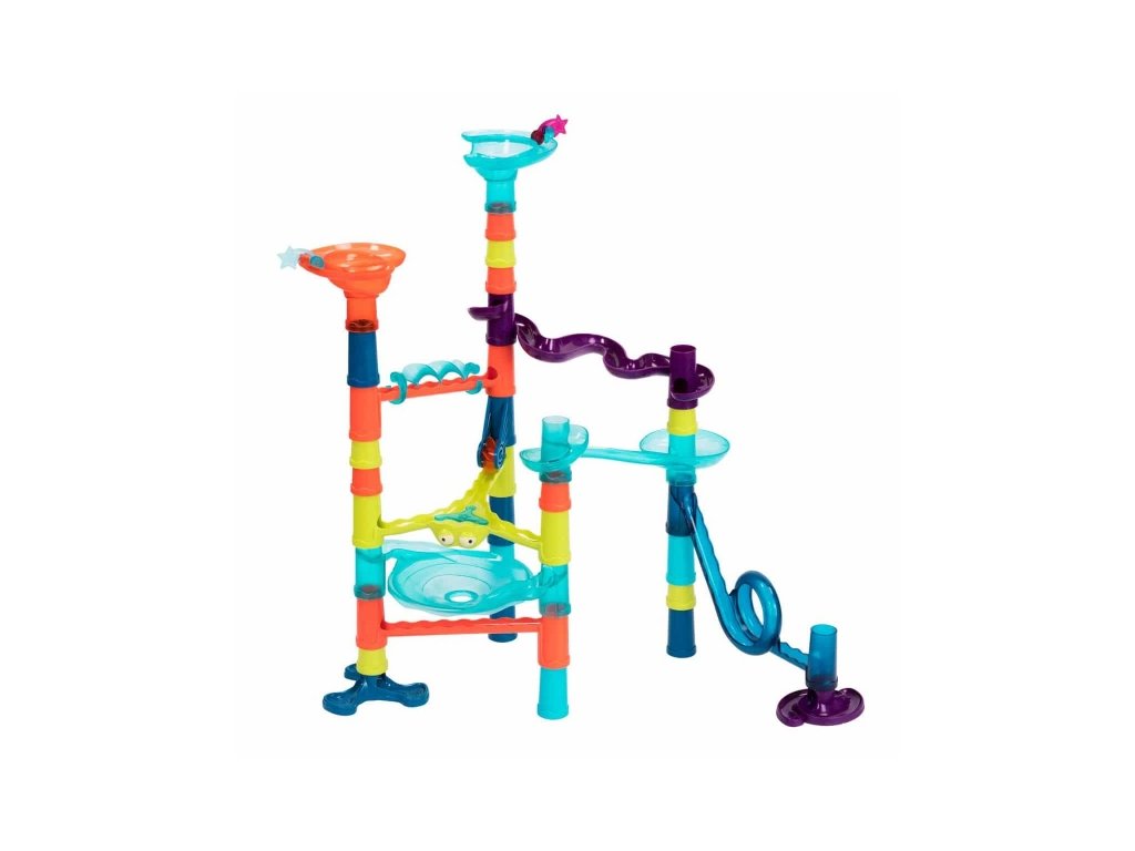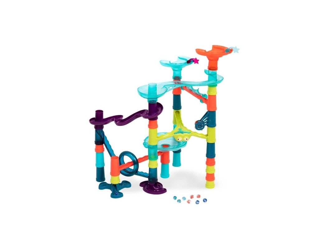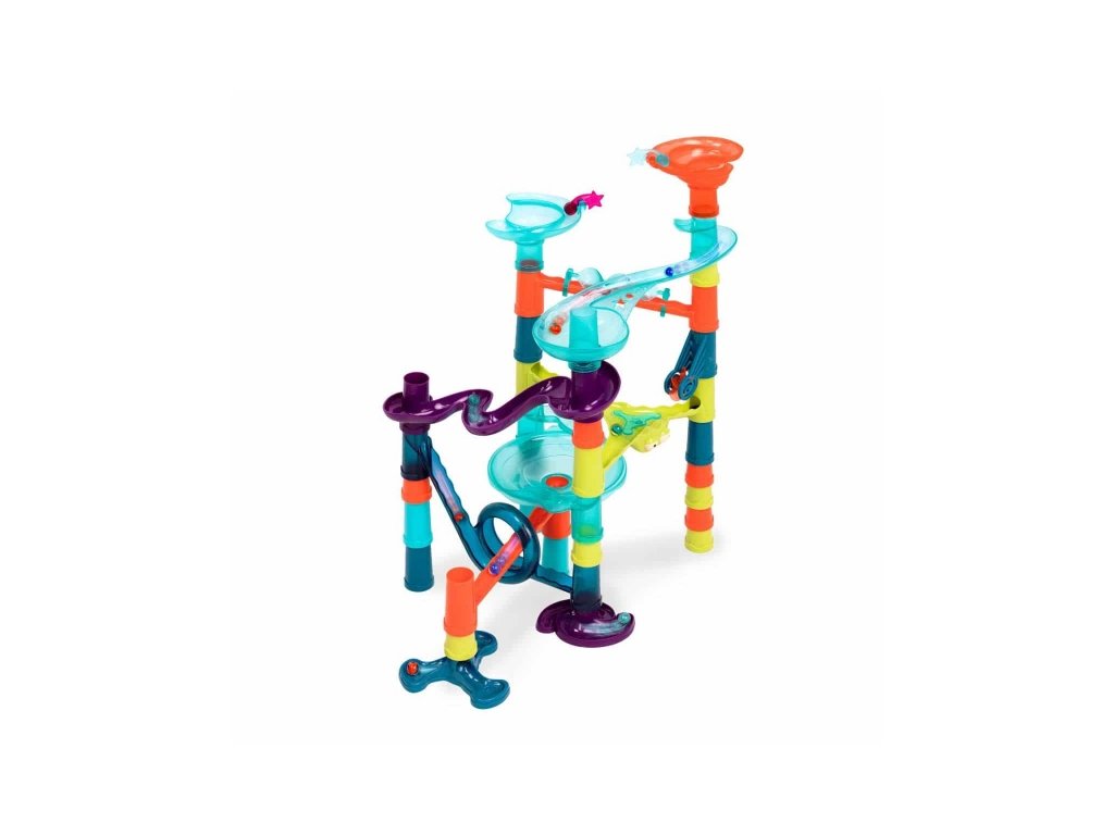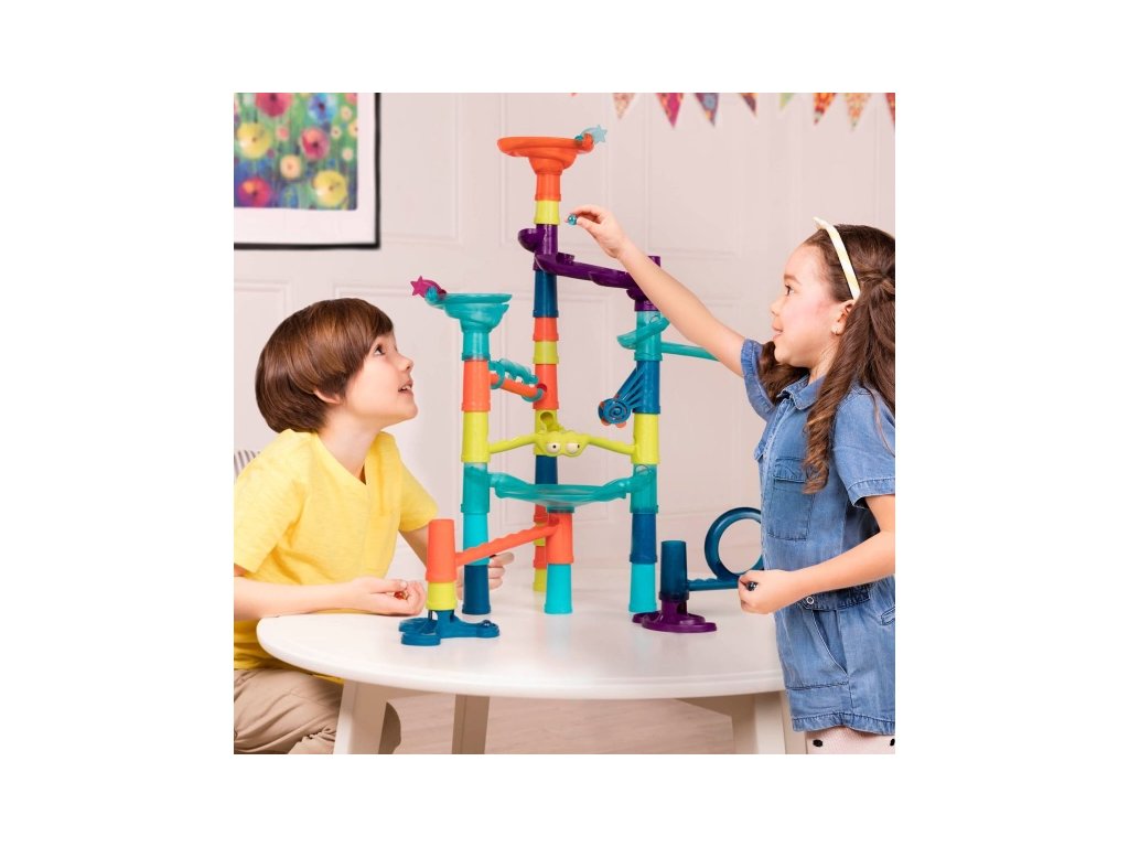 Postavte spolu s vašimi dětmi dráhu obsahující vysoké věže, kroutící se mosty i různorodé pohyblivé části a pak si užijte sledování pohybu kuliček celým bludištěm.