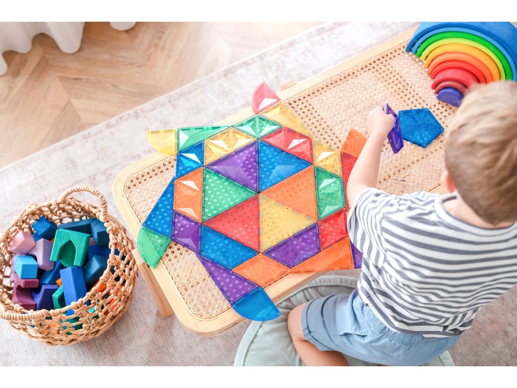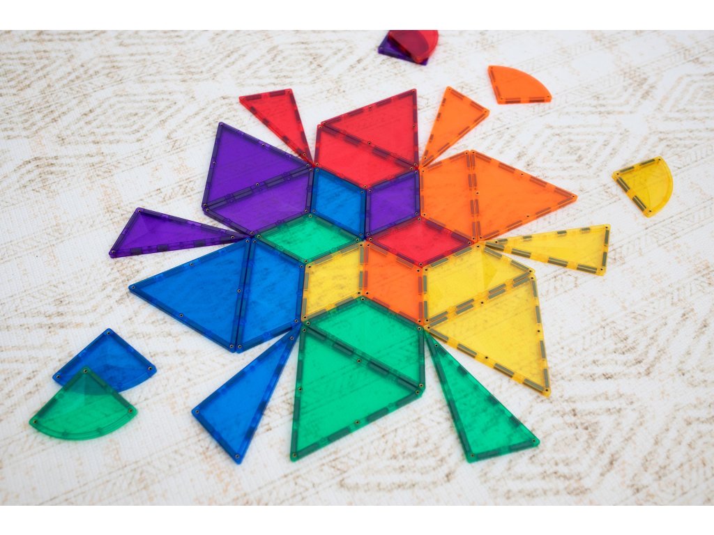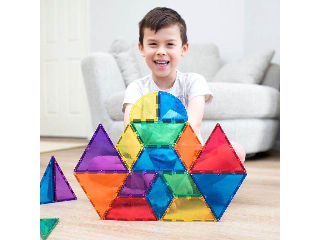 Odemkněte si zcela nový svět vzrušujících herních možností, když děti budou používat pravoúhlé trojúhelníky k vytváření rychlých ramp, raketových ploutví, podpěr mostů a vysokých staveb. Zkoumejte zlomky, vytvářejte zatáčky na cestách a objevujte hru na role s našimi výsečemi kruhů, když si budete vytvářet vlastní pizzy, dorty a koláče. Rozšiřte si povědomí o tom, jak se tvary skládají do sebe, když budete z lichoběžníků nebo kosočtverců vytvářet velké šestiúhelníky a inspirovat se k navrhování květin a motýlů. Zkuste si navrhnout a postavit fascinující kopuli, která je ideální pro zážitek z lomu světla. Jediným limitem je vaše fantazie!
