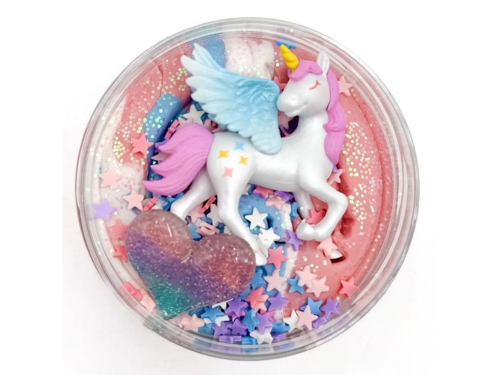 250g domácí čtyřbarevné modelíny, třpytky, konfety, jednorožec a srdíčko.