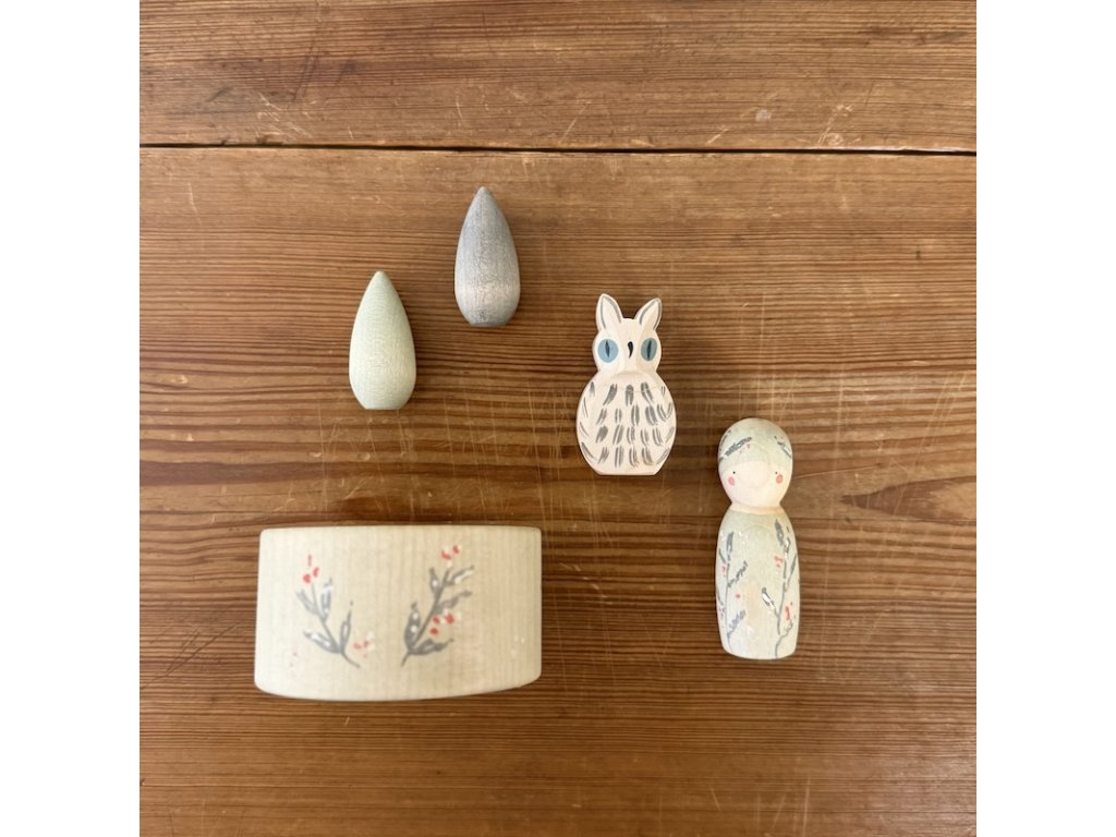 1 miska: Univerzální dřevěná miska, která může sloužit k ukládání pokladů, jako součást domečku nebo jako rybník pro zimní stvoření.