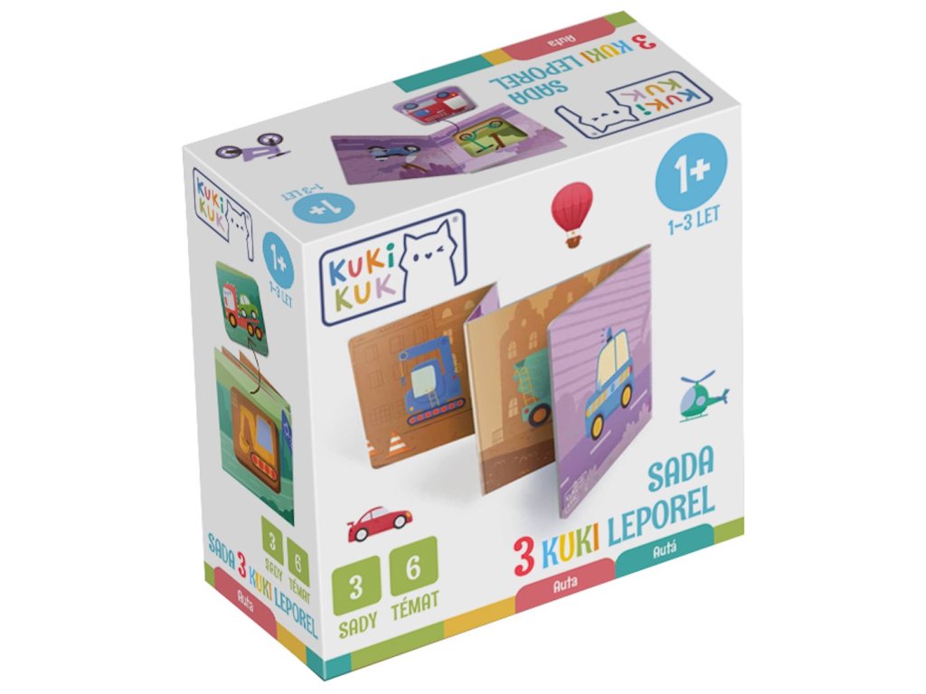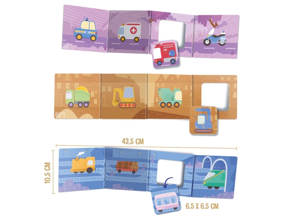 Tři oboustranná harmoniková leporela s okénky a čtvercovými vkládacími žetony. Na každém leporelu najdete čtyři vozidla vždy z jednoho tematického světa - staveniště, záchranáři, železnice atd. Celkem šest prostředí a 24 vozidel.
