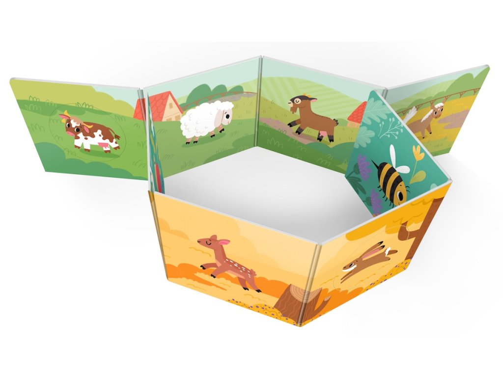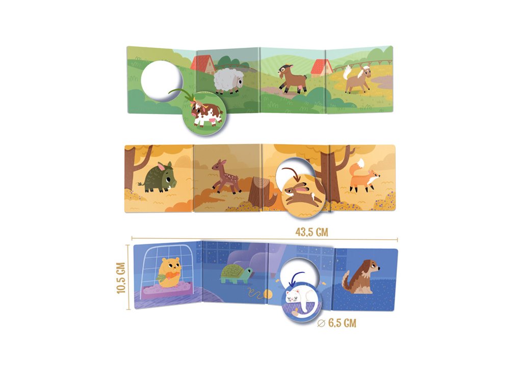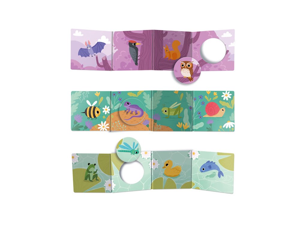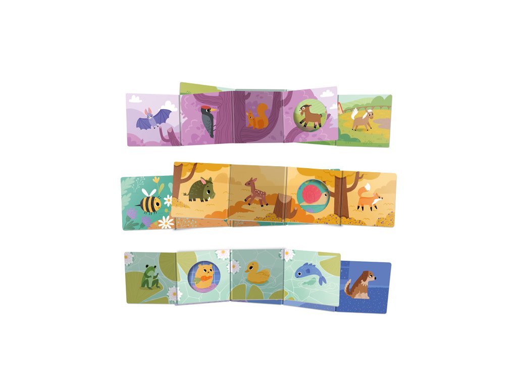 Tři oboustranná harmoniková leporela s okénky a kulatými vkládacími žetony. Každé leporelo se věnuje jinému prostředí - louka, les, pastvina atd. Zde najdete vždy 4 zvířátka; celkem šest prostředí a 24 zvířat.
