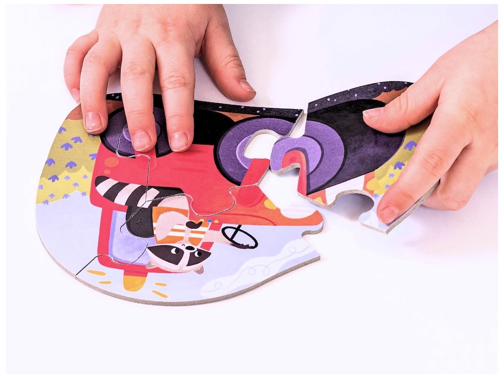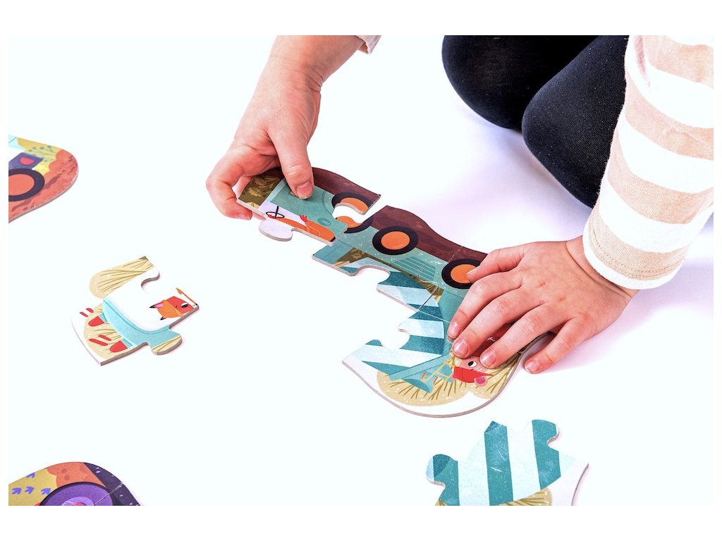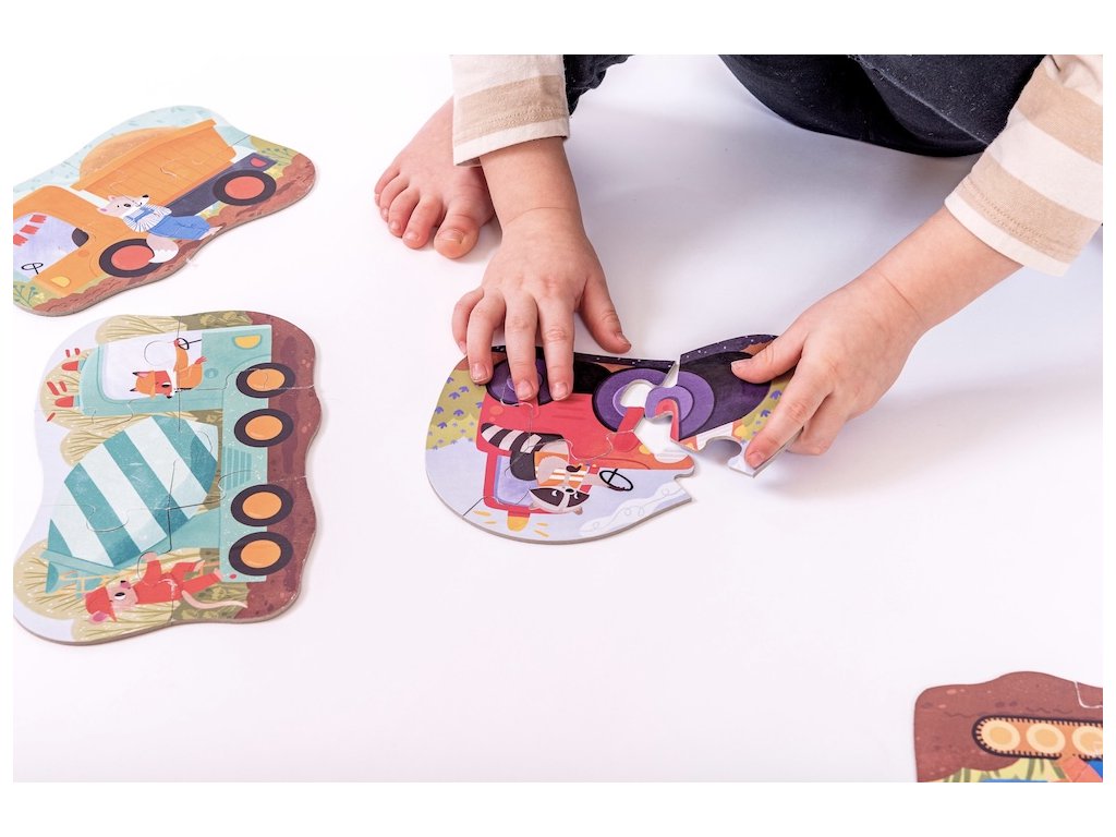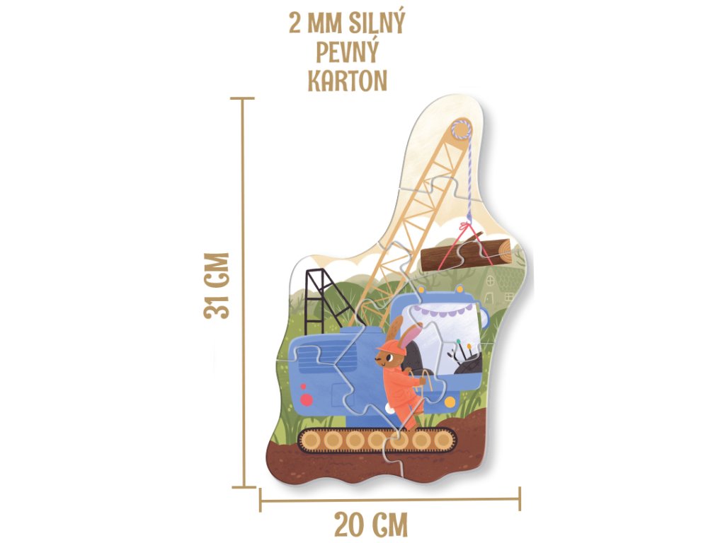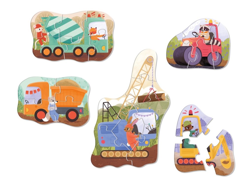 Veselé puzzle pro malé stavitele od 2 let. Malé děti si snadno poradí s extra velkými a 2 mm silnými pevnými dílky. Obsahuje 5 různých stavebních strojů – od jednoduchých dvoudílných po velké sedmidílné puzzle, které má rozměry 31 x 20 cm!