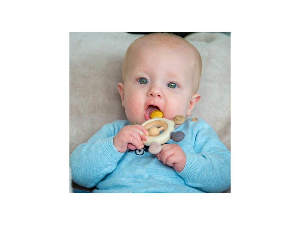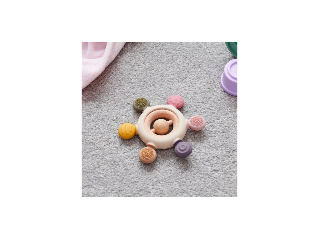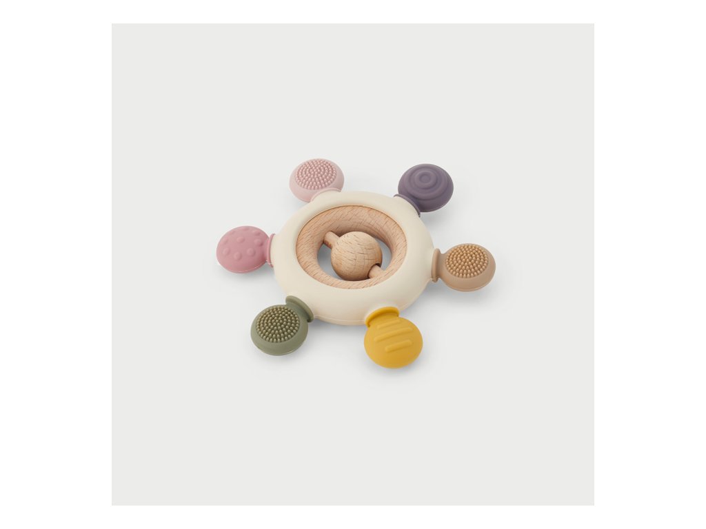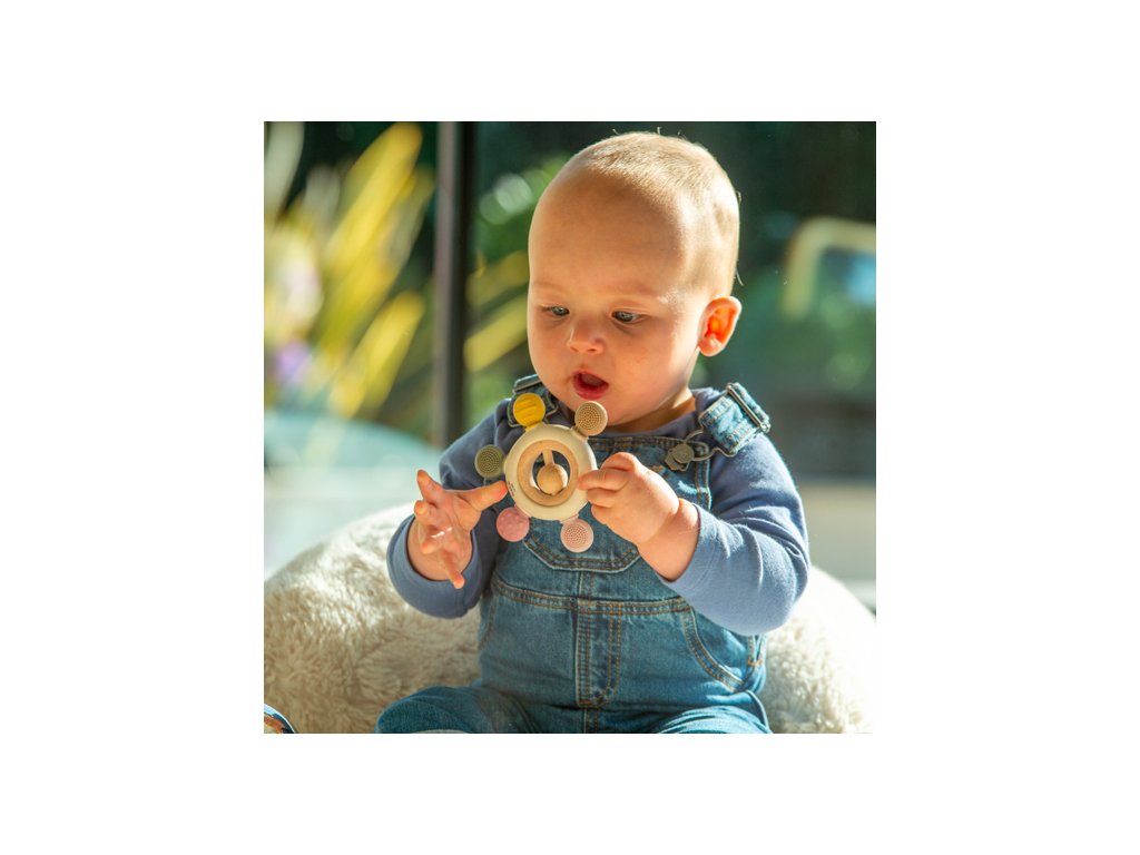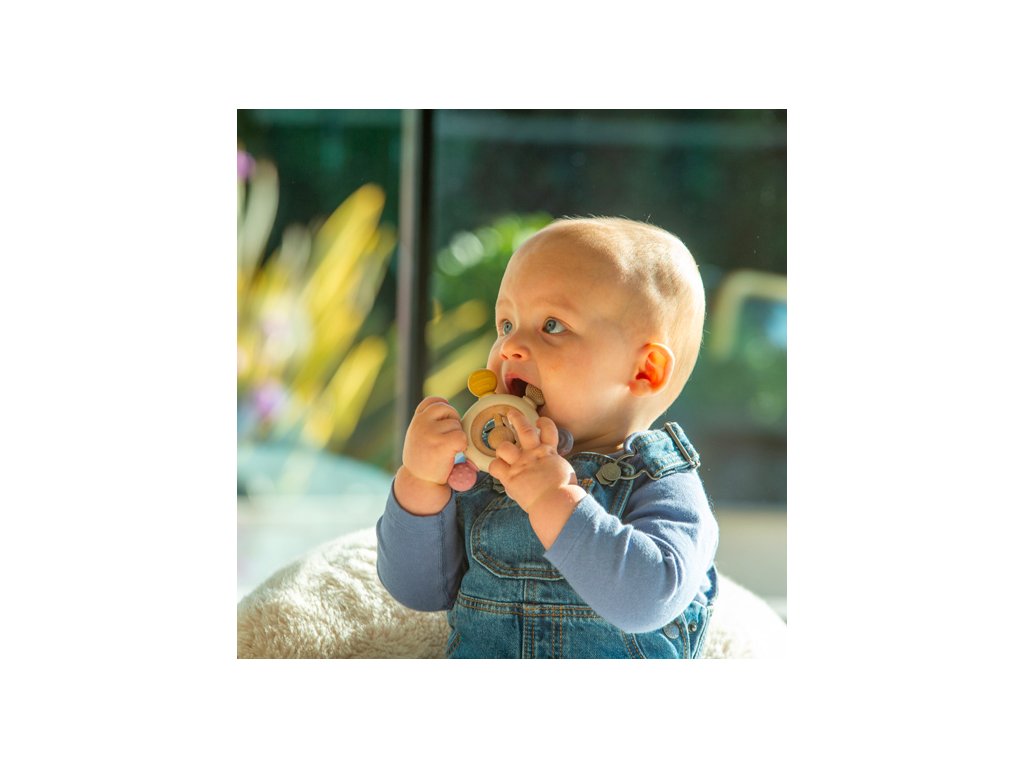 Díky různým texturám, barvám a dřevěnému chrastítku uprostřed poskytuje toto kousátko zábavné rozptýlení pro malá miminka. Texturovaný silikon poskytuje uklidňující úlevu pro bolavé dásně při prořezávání zoubků. Jemný zvuk dřevěného chrastítka pak upoutá pozornost miminek, podporuje sluchové zkoumání a koordinaci ruka-oko.