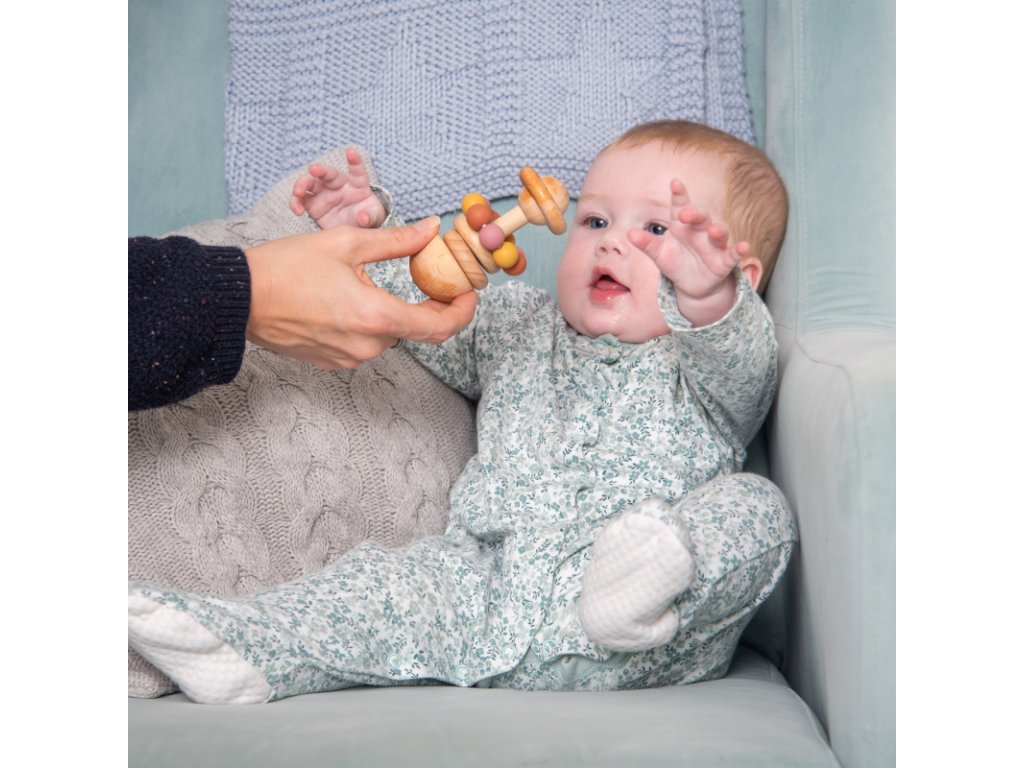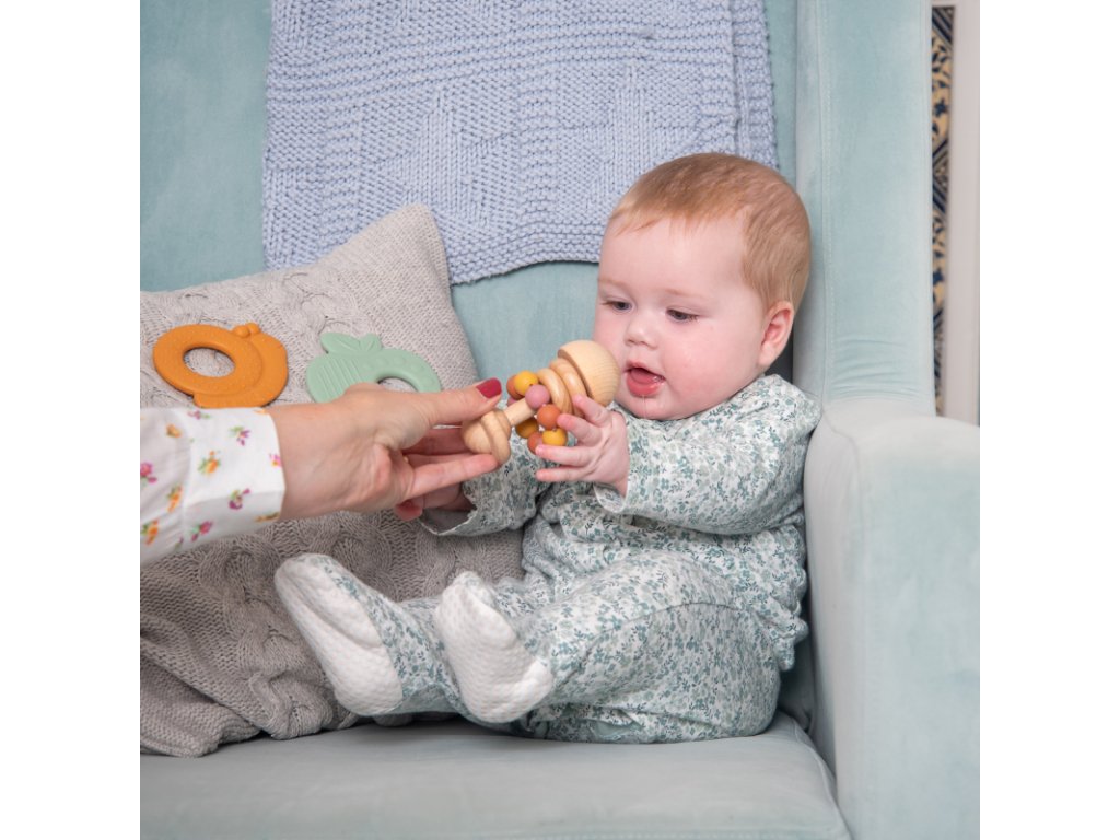 Kontrastní textury dřevěných kroužků a silikonových korálků vybízejí miminka k uchopení, třesení a manipulaci s chrastítkem, což pomáhá posilovat jejich zručnost a koordinaci ruka-oko.