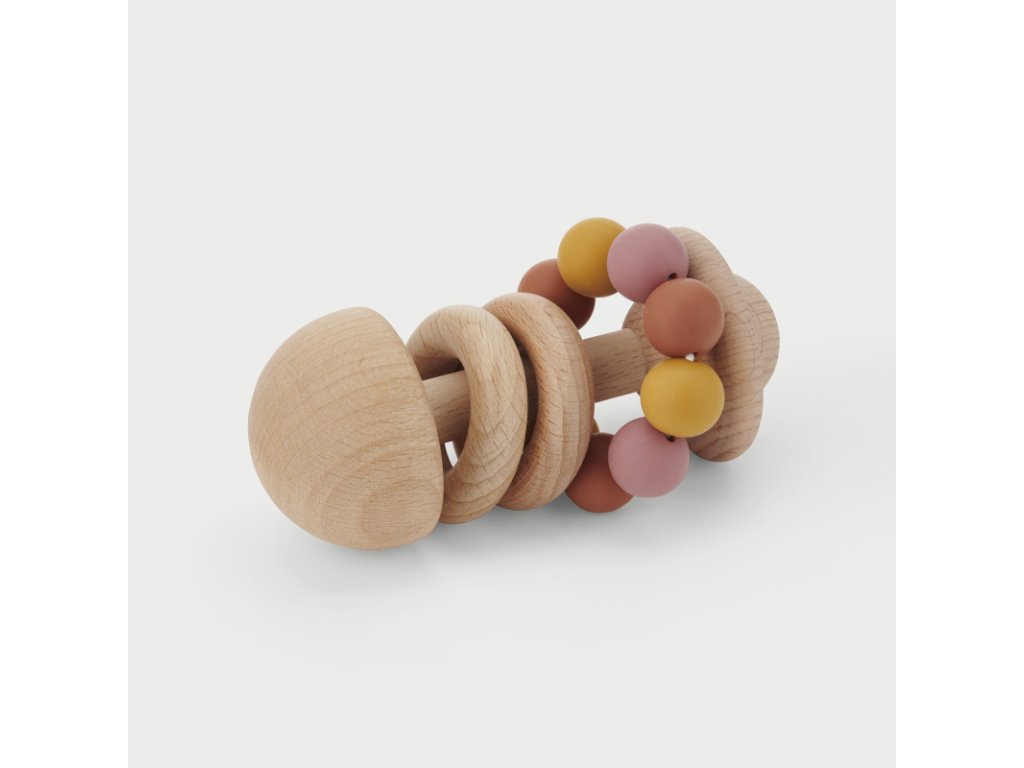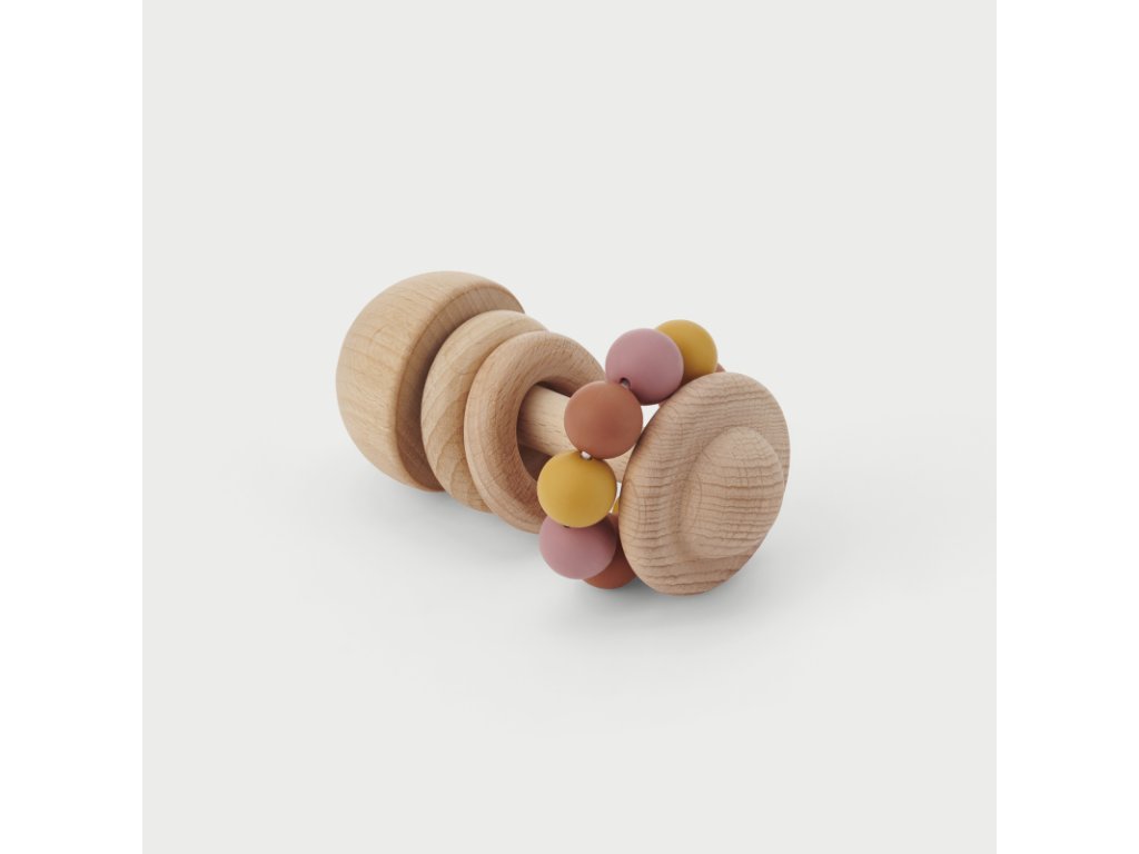 Vyrobeno z přírodního bukového dřeva a bezpečného potravinářského silikonu, toto chrastítko je nejen krásné, ale i funkční.