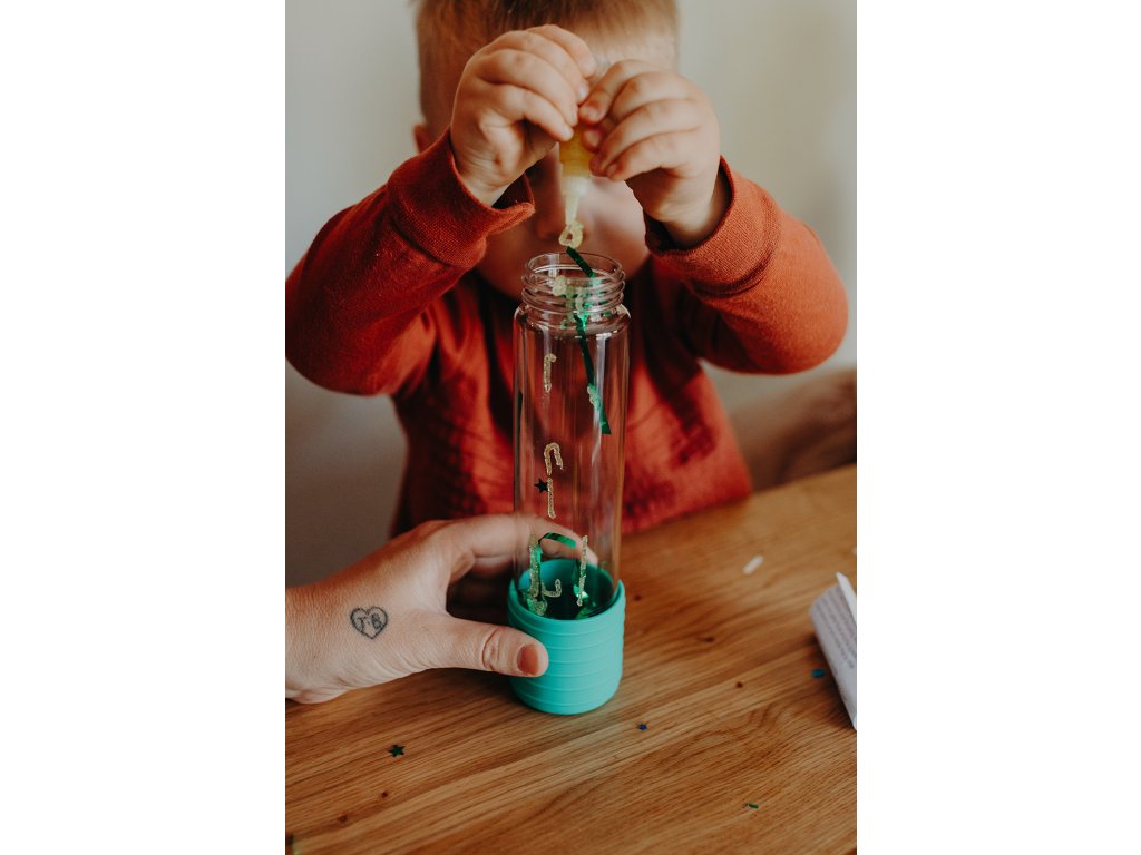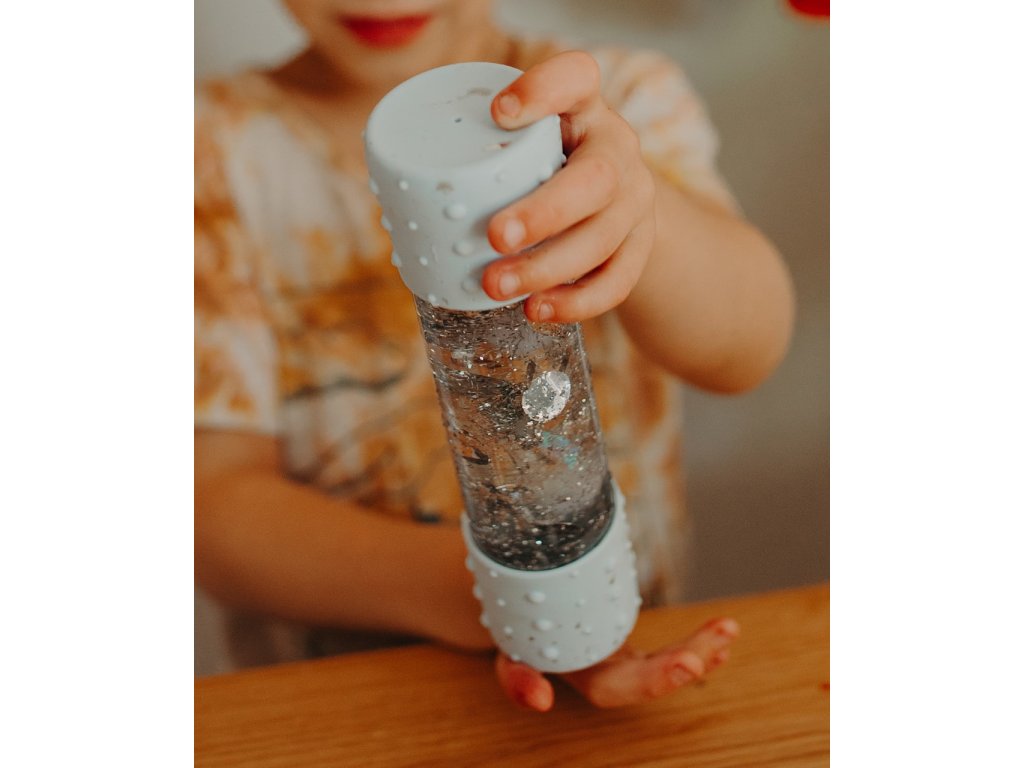 Stačí přidat vodu a trochu mycího prostředku a je připraveno! Vše máte totiž již v balíčku. Díky této možnosti můžete znovu naplnit a znovu použít senzorickou láhev pro nekonečné hodiny zábavy.