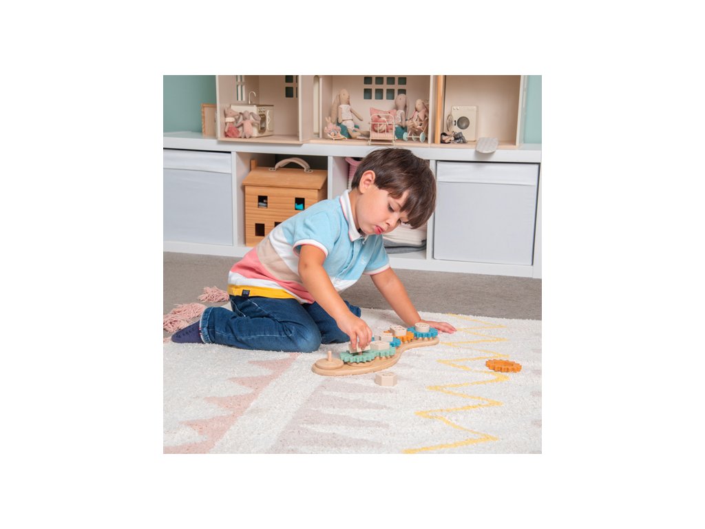 Skládačka obsahuje 19 kusů a je vyrobena z bezpečného potravinářského silikonu a bambusu, což zajišťuje jeho nezávadnost a odolnost.