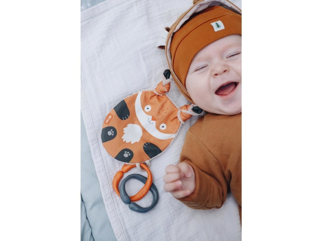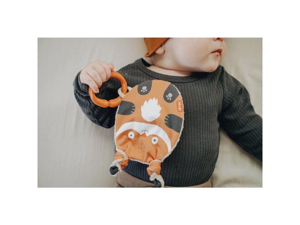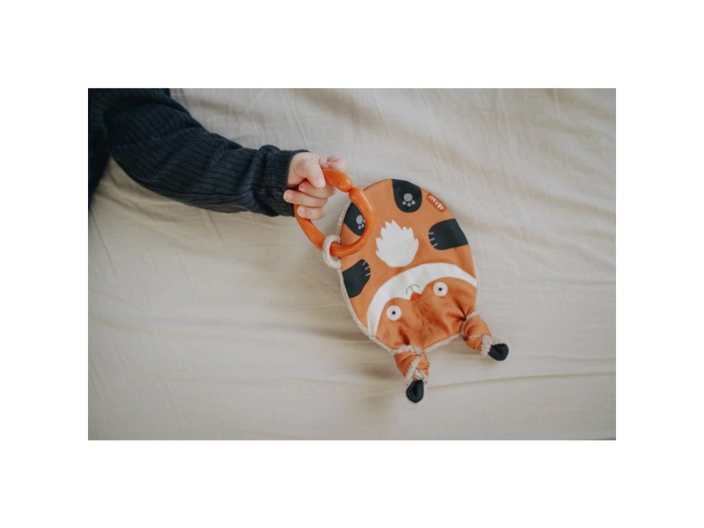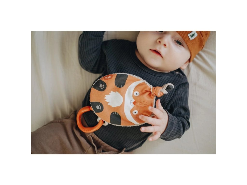 Tvar a velikost jsou ideální pro malé dětské ručičky. Při pokusech o první úchopy jemně praská. Zamotané uši můžete podle chuti rozvázat, ale jeho uzlíky se budou báječně ocucávat. Zadní strana z bambusového heboučkého froté je super savá a odvede veškerou vlhkost při ocucávání. Bambus je přirozeně antiseptický a uschne závratnou rychlostí.