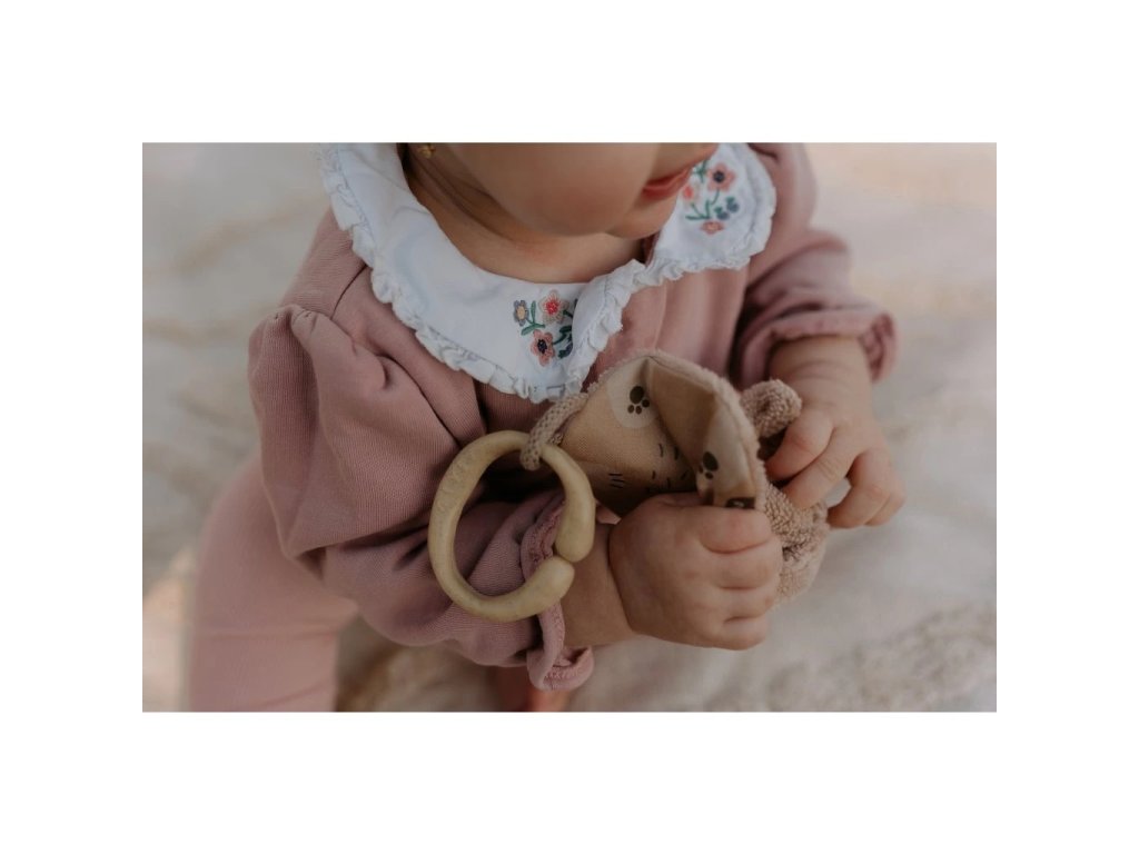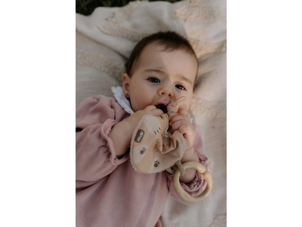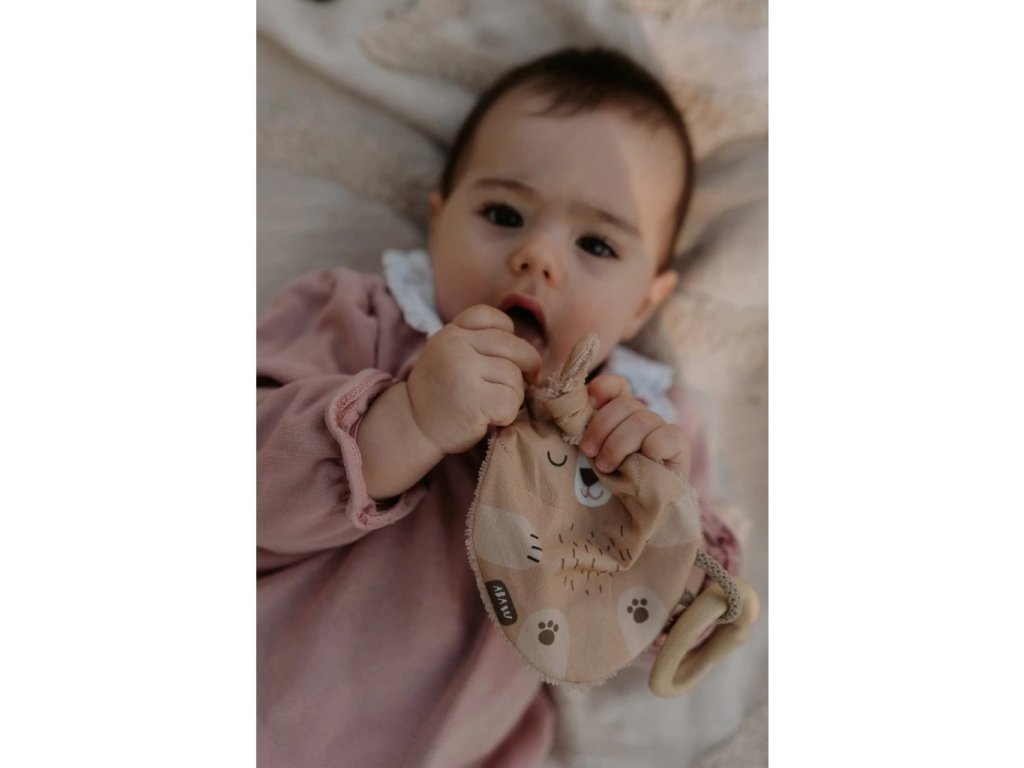 Tvar a velikost jsou ideální pro malé dětské ručičky. Při pokusech o první úchopy jemně praská. Zamotané uši můžete podle chuti rozvázat, ale jeho uzlíky se budou báječně ocucávat. Zadní strana z bambusového heboučkého froté je super savá a odvede veškerou vlhkost při ocucávání. Bambus je přirozeně antiseptický a uschne závratnou rychlostí.