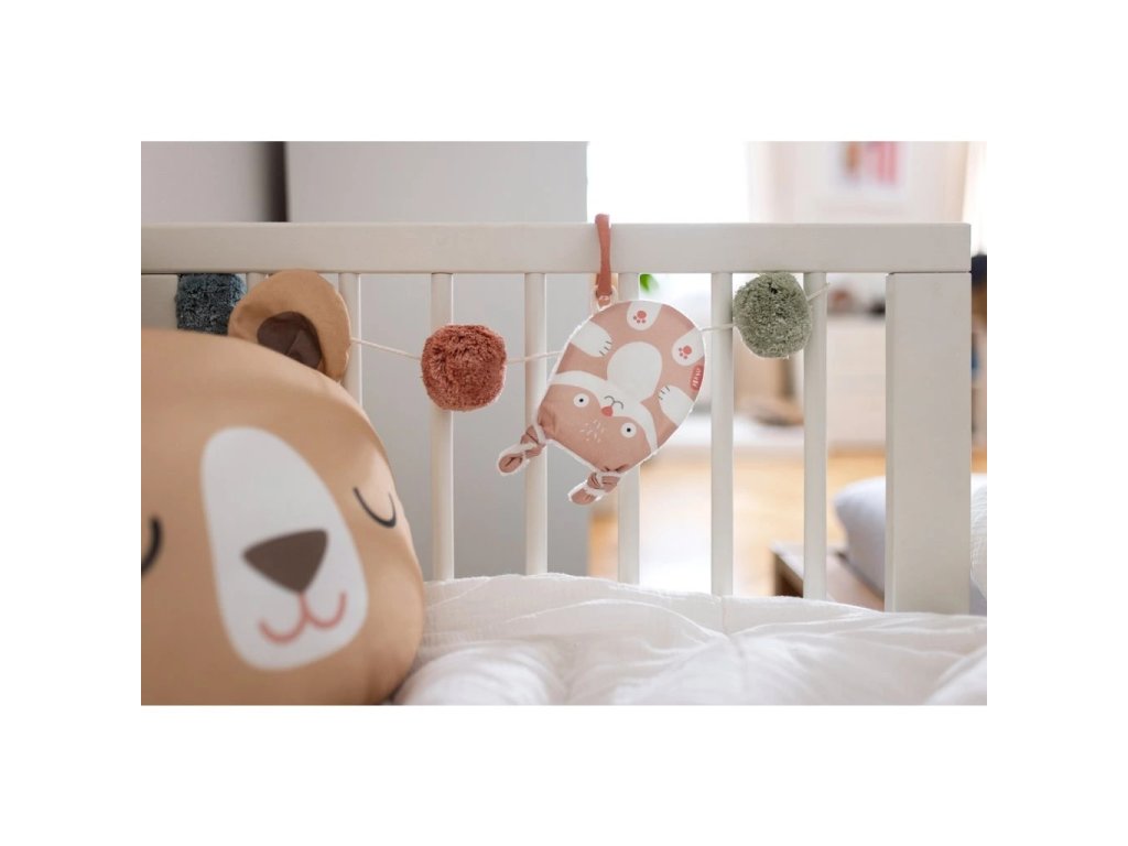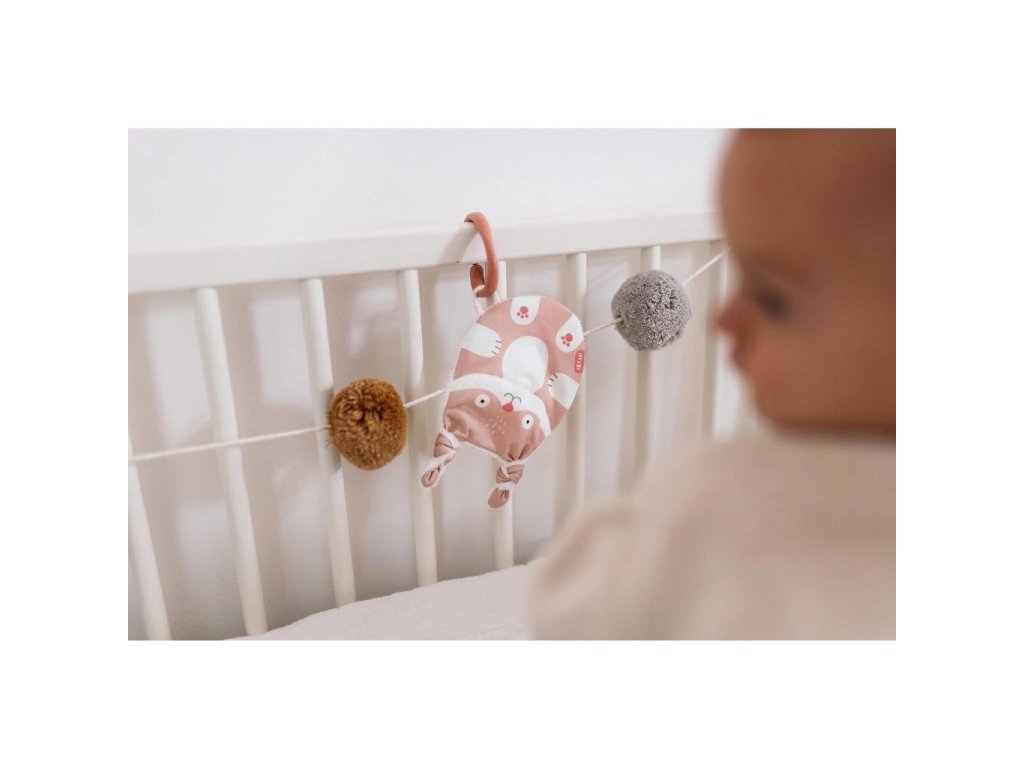 Tvar a velikost jsou ideální pro malé dětské ručičky. Při pokusech o první úchopy jemně praská. Zamotané uši můžete podle chuti rozvázat, ale jeho uzlíky se budou báječně ocucávat. Zadní strana z bambusového heboučkého froté je super savá a odvede veškerou vlhkost při ocucávání. Bambus je přirozeně antiseptický a uschne závratnou rychlostí.