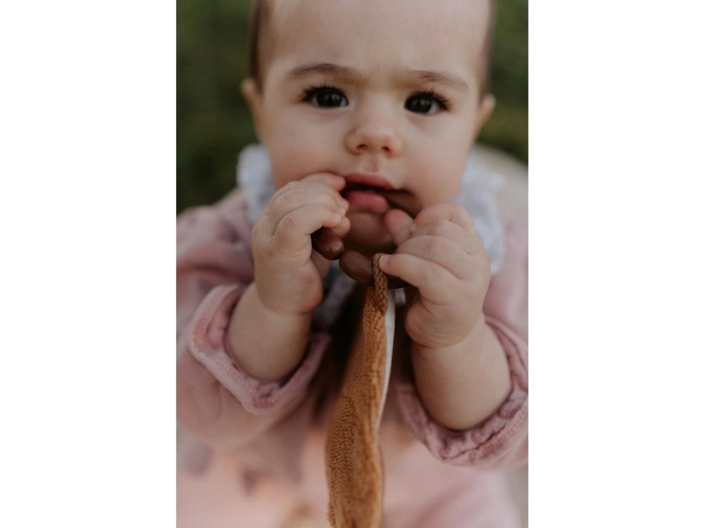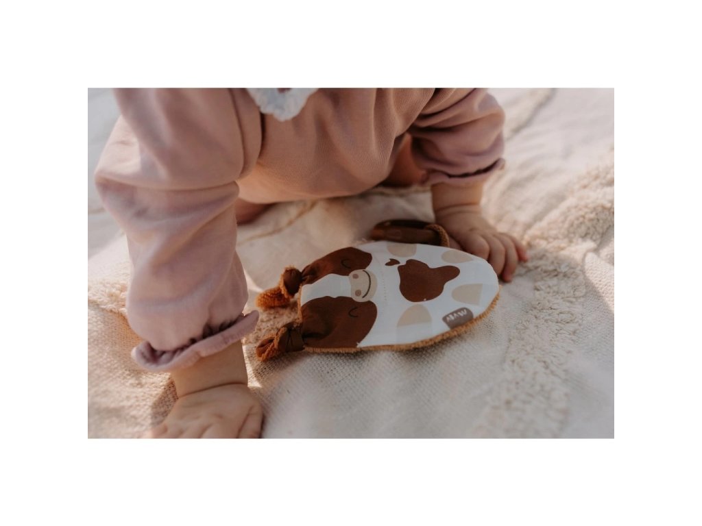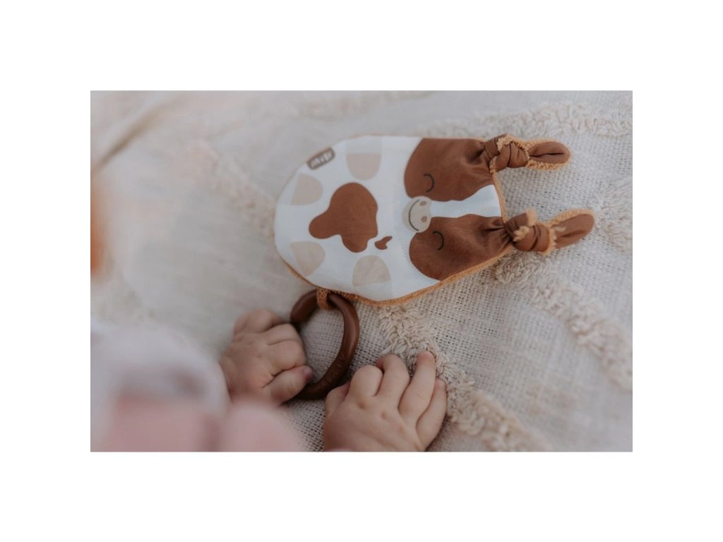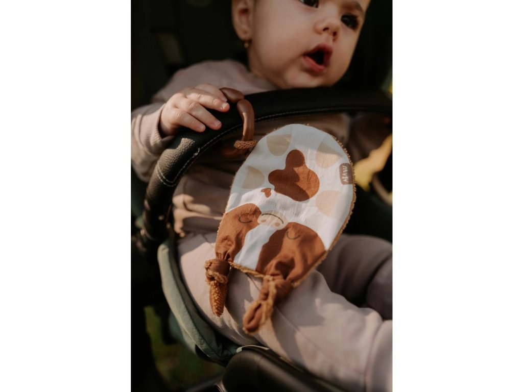Tvar a velikost jsou ideální pro malé dětské ručičky. Při pokusech o první úchopy jemně praská. Zamotané uši můžete podle chuti rozvázat, ale jeho uzlíky se budou báječně ocucávat. Zadní strana z bambusového heboučkého froté je super savá a odvede veškerou vlhkost při ocucávání. Bambus je přirozeně antiseptický a uschne závratnou rychlostí.