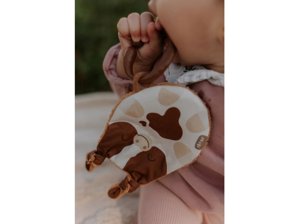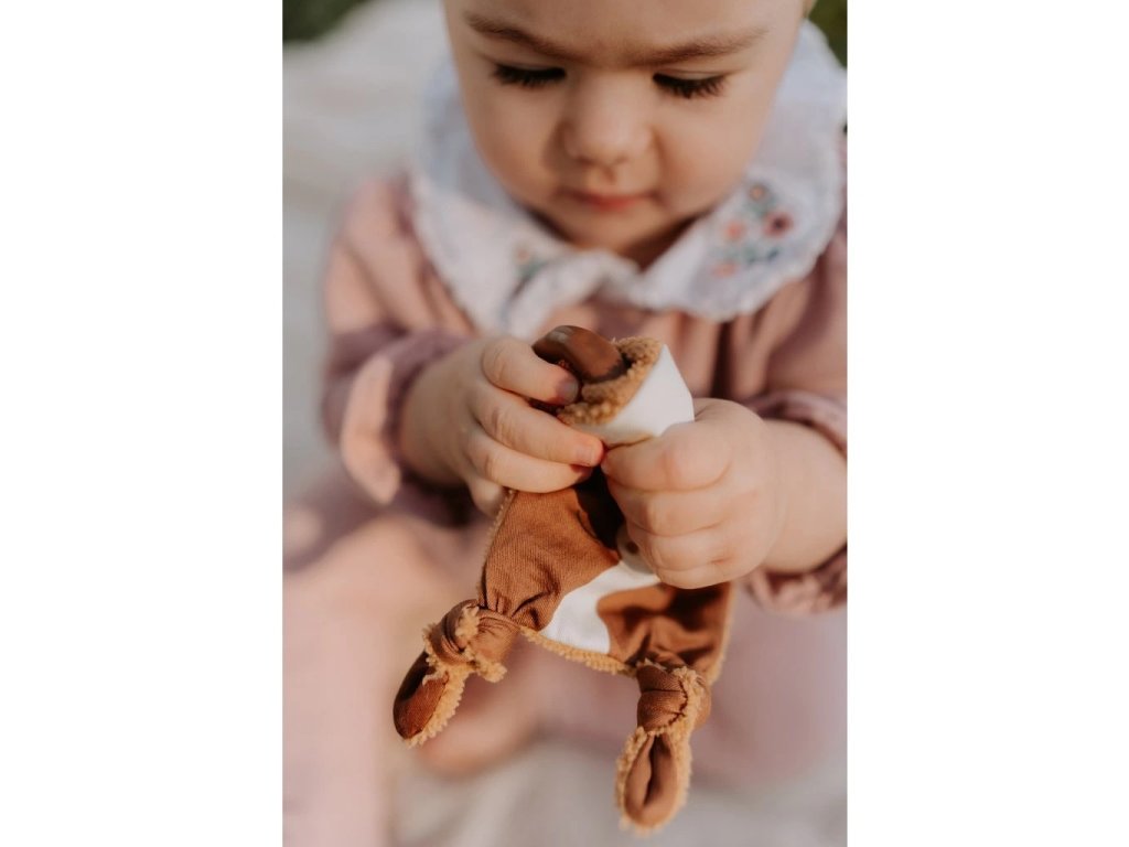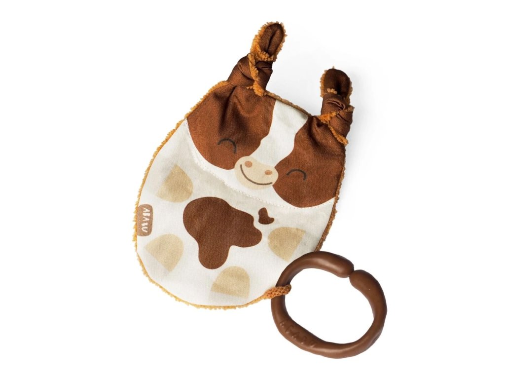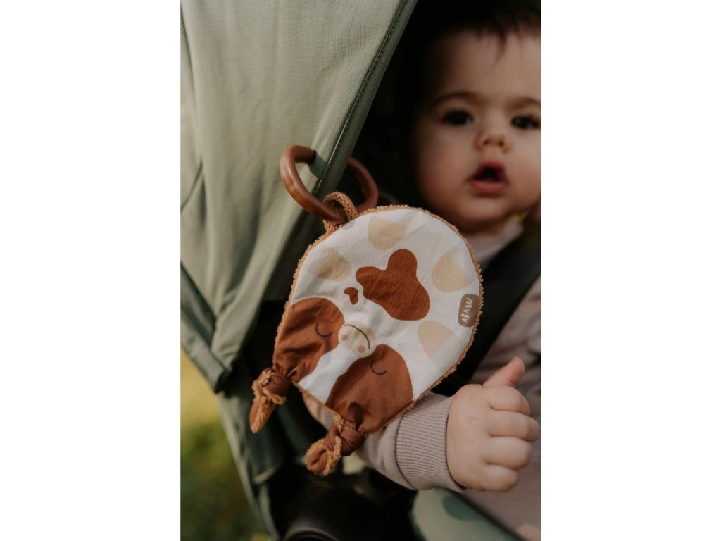 Tvar a velikost jsou ideální pro malé dětské ručičky. Při pokusech o první úchopy jemně praská. Zamotané uši můžete podle chuti rozvázat, ale jeho uzlíky se budou báječně ocucávat. Zadní strana z bambusového heboučkého froté je super savá a odvede veškerou vlhkost při ocucávání. Bambus je přirozeně antiseptický a uschne závratnou rychlostí.