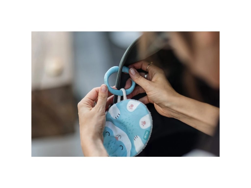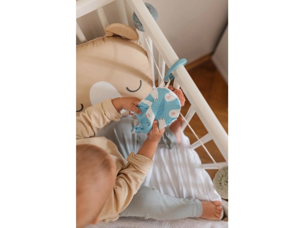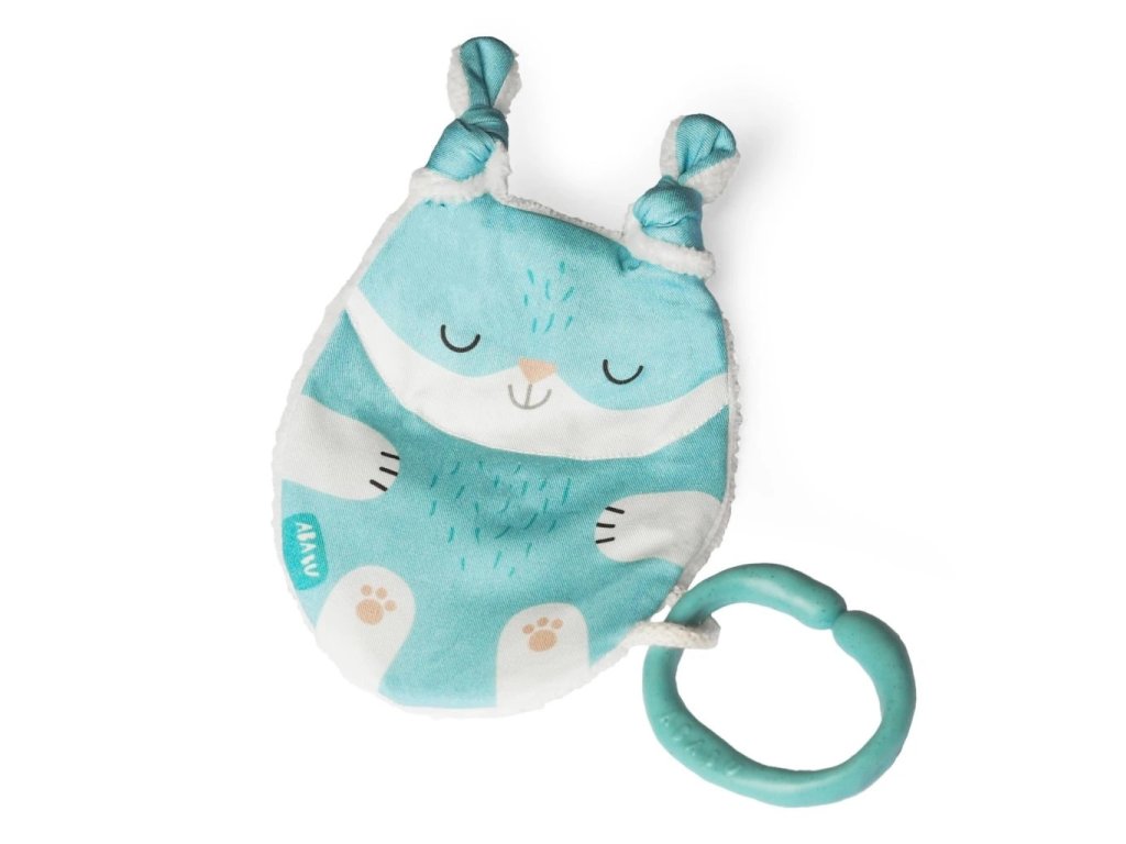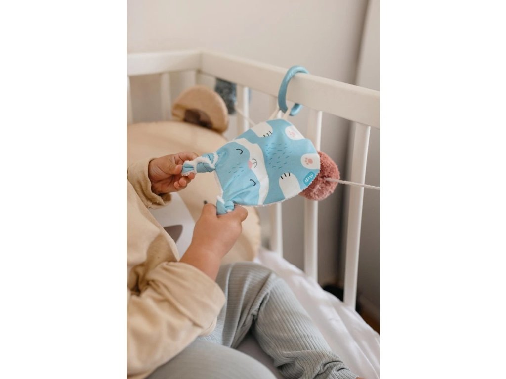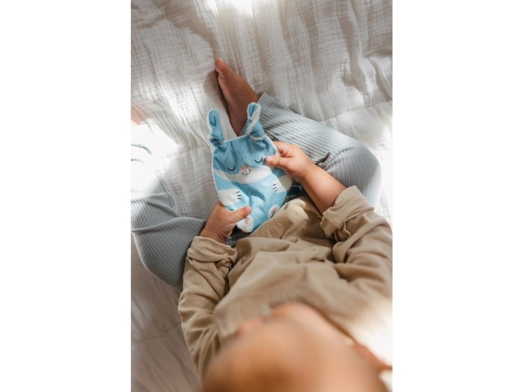 Tvar a velikost jsou ideální pro malé dětské ručičky. Při pokusech o první úchopy jemně praská. Zamotané uši můžete podle chuti rozvázat, ale jeho uzlíky se budou báječně ocucávat. Zadní strana z bambusového heboučkého froté je super savá a odvede veškerou vlhkost při ocucávání. Bambus je přirozeně antiseptický a uschne závratnou rychlostí.
